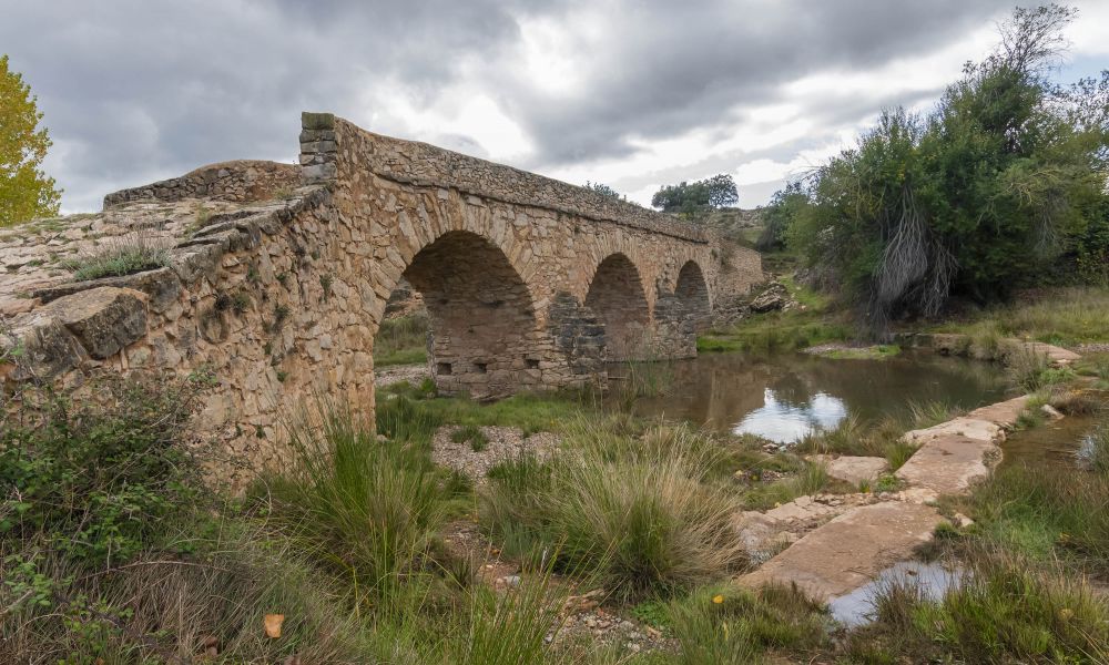Este puente se encuentra sobre el río Maimona en San Agustín (Teruel). Se construyo para cruzar el río Maimona, y pasar de Pradas a las masías del otro lado. Como ves, tiene tres ojos de medio punto, y calzada adoquinada.