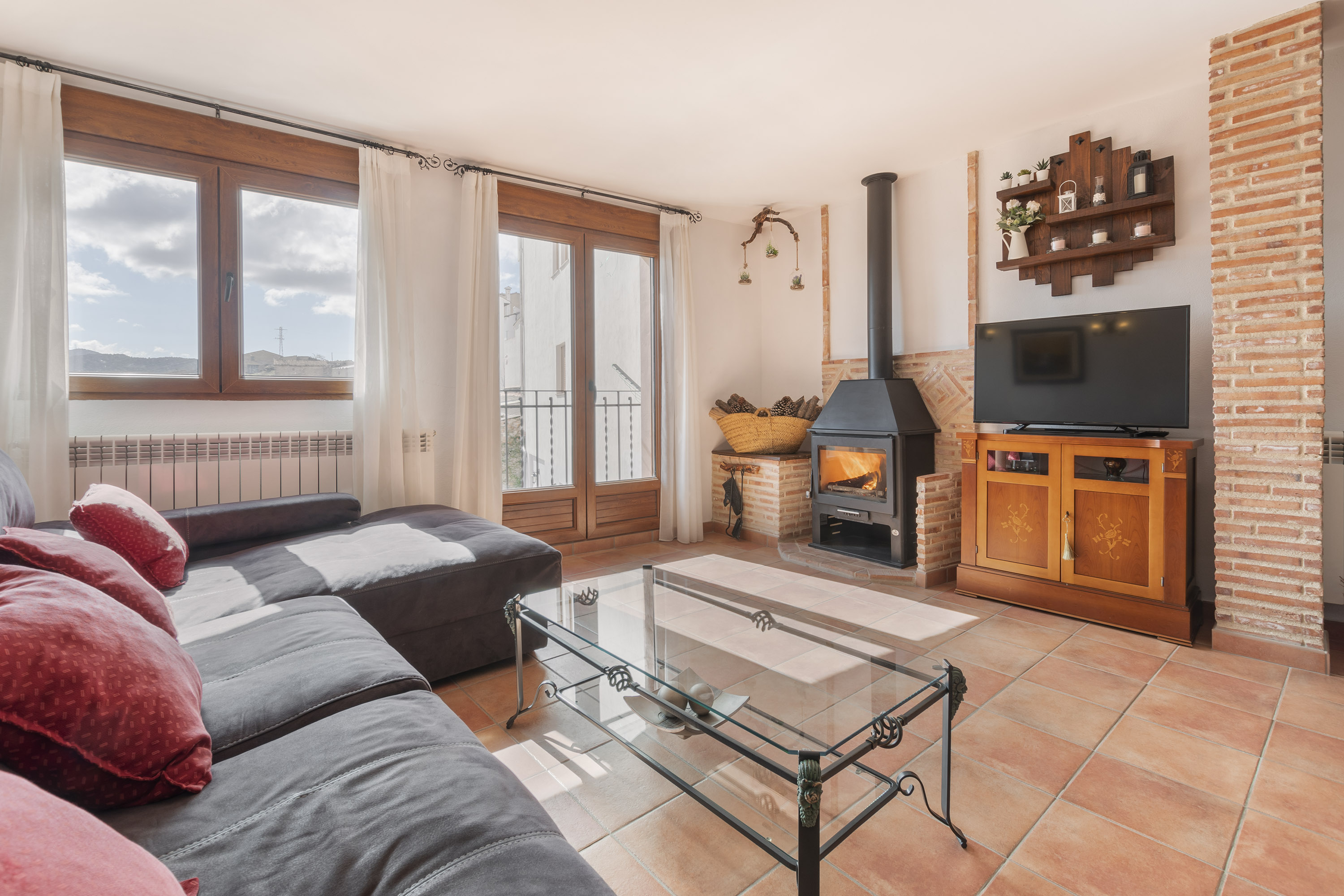 Nuestro apartamento LAS ENCINAS está ubicado en la primera planta del edificio y cuenta con una cocina-comedor amplia con balcón con vistas a la montaña; una habitación doble con chimenea; dos habitaciones de dos camas; otra habitación doble y dos baños.