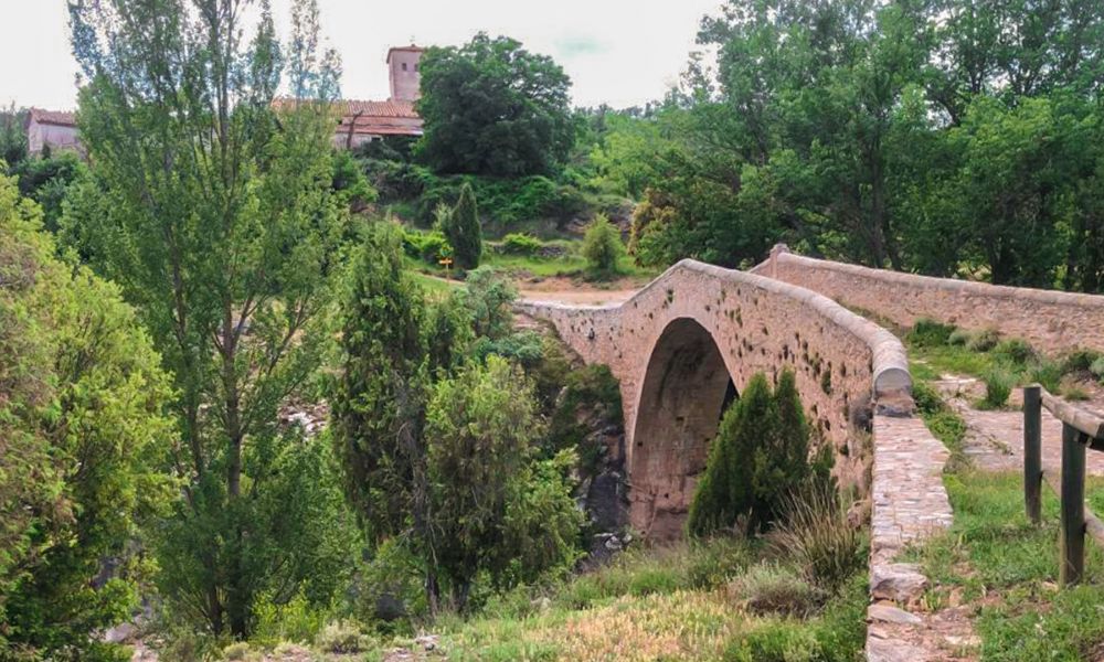 Este puente se encuentra sobre el río Maimona en San Agustín (Teruel). Se construyo para cruzar el río Maimona, y pasar de Pradas a las masías del otro lado. Como ves, tiene tres ojos de medio punto, y calzada adoquinada.